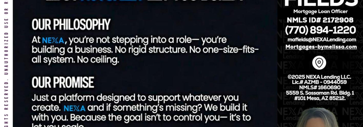 Hi, my name is Melissa Fields. I’m a Loan Officer with NEXA Lending LLC., offering personalized mortgage solutions, fast customized quotes, great rates and service with integrity.